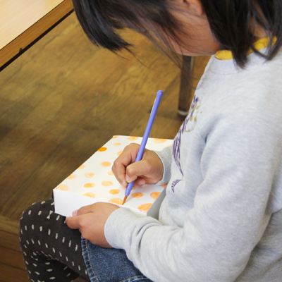 お弁当箱の装飾中。オレンジの水玉模様を描いています。