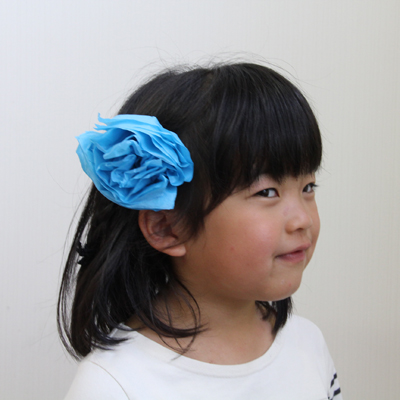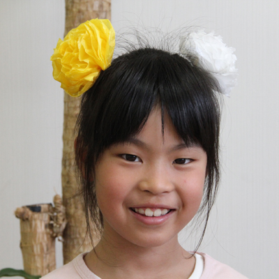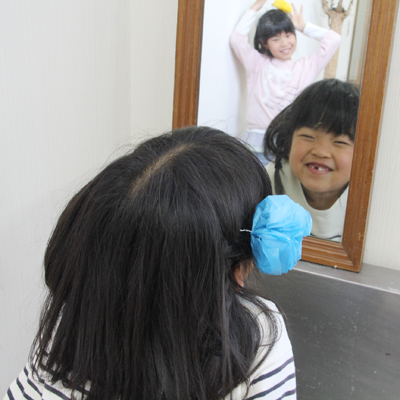 一つ目が完成するなり、 早速、髪飾りにして、鏡に映して大はしゃぎ。