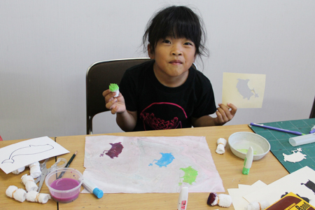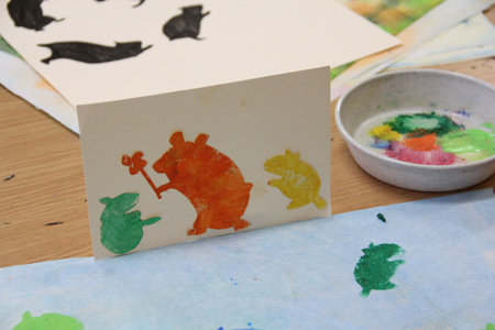 型をカッターで切り抜き、これが版になります。その上から絵具を刷り込んでいく。