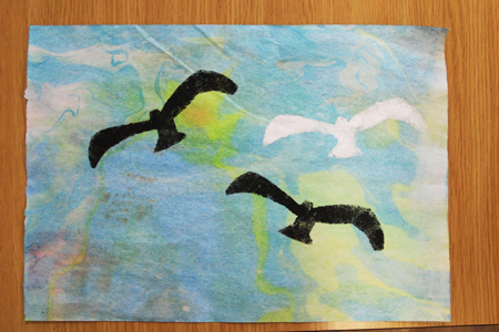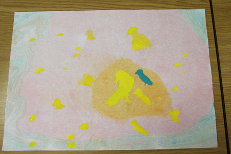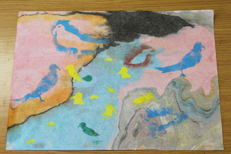 川辺の鳥たちを絵にしたようです。マーブリングの模様をうまくいかしてますね。