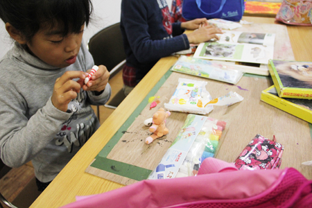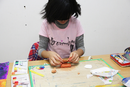 絵を描き終えて、紙粘土にとりかかるかのんちゃん。
