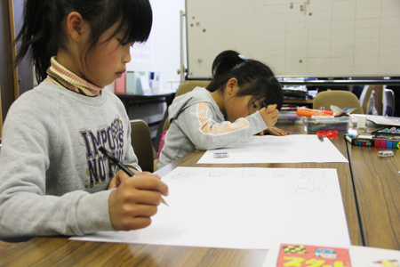 四つ切の画用紙にポスカや油性ペンで思い思いに描いていきます。