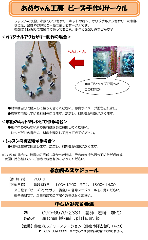 ※レッスン内容の詳細は、岩崎までお電話等でお問い合わせ下さい。 電話 090-6579-2331(講師:岩崎 加代) E-Mail amechan_k@kmail.plala.or.jp