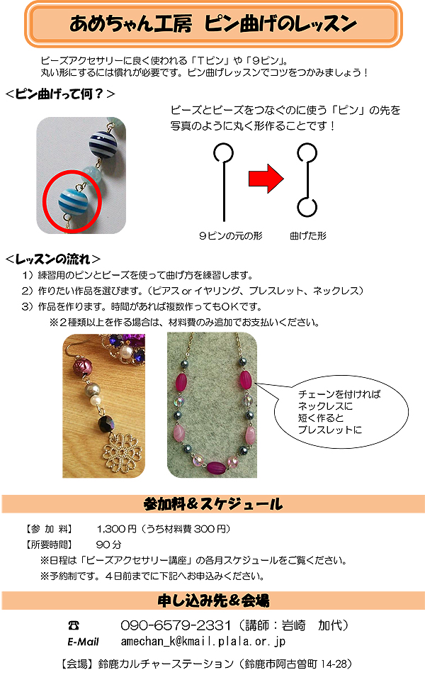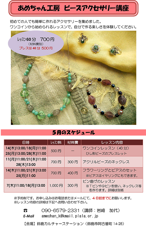 ※レッスン内容の詳細は、岩崎までお電話等でお問い合わせ下さい。 電話 090-6579-2331(講師:岩崎 加代) E-Mail amechan_k@kmail.plala.or.jp