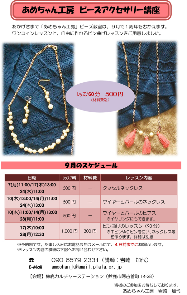 ※レッスン内容の詳細は、岩崎までお電話等でお問い合わせ下さい。 電話 090-6579-2331(講師:岩崎 加代) E-Mail amechan_k@kmail.plala.or.jp