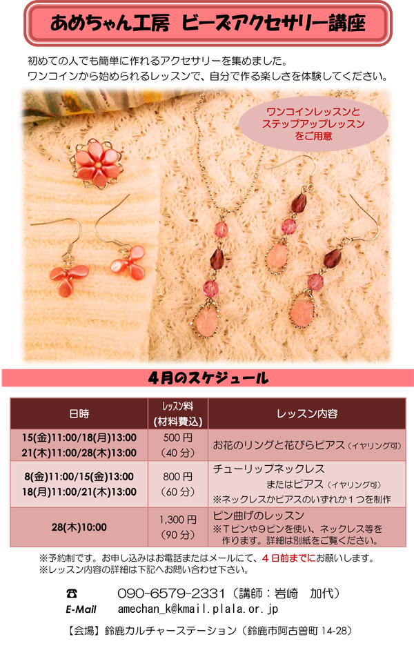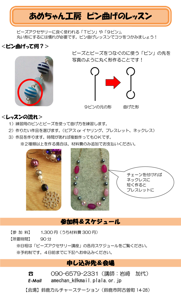 ※レッスン内容の詳細は、岩崎までお電話等でお問い合わせ下さい。 電話 090-6579-2331(講師:岩崎 加代) E-Mail amechan_k@kmail.plala.or.jp