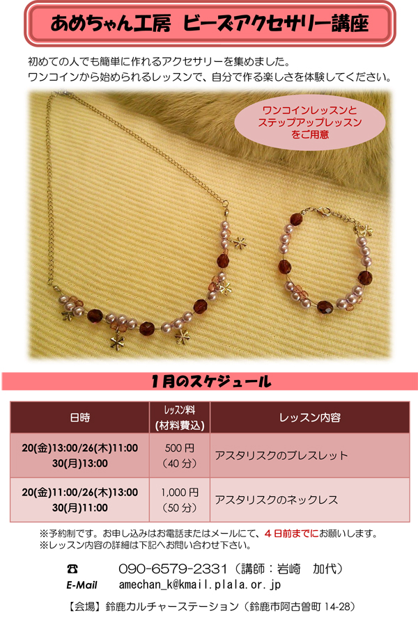 ※レッスン内容の詳細は、岩崎までお電話等でお問い合わせ下さい。 電話 090-6579-2331(講師:岩崎 加代) E-Mail amechan_k@kmail.plala.or.jp