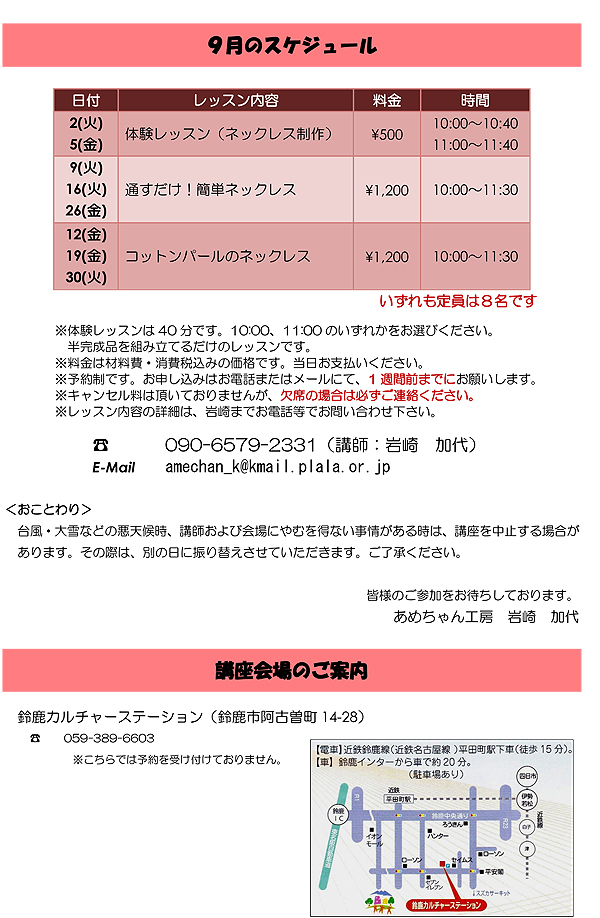 ※レッスン内容の詳細は、岩崎までお電話等でお問い合わせ下さい。