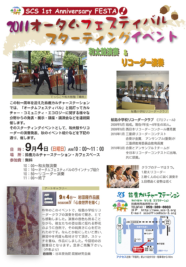 そのスターティングイベントとして、和太鼓やリコーダーの演奏発表、秋のイベント紹介などを下記の通り、催します。