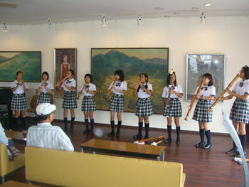 昨年のこのイベントで、桜島小学校リコーダークラブの演奏を初めて聞き、とても感動しました。演奏の音色も然ることながら、彼女たちの姿は風に揺れる野花のように自然で、その純真さに心を打たれたのです。なんとか絵にしたいと思い、練習中を何度も取材させて頂き、スケッチを重ね、作品にしました。今回初のお披露目となります。是非ご高覧下さい。(作者より)