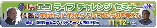 また早々に脱原発を打ち出したドイツの現況を、エクハルト・ハーン先生から報告していただきます。東北から、ドイツから、それぞれ生の声をふまえて、これからの私たちの暮らしやコミュニティづくりをもう一度見直してみたいと思います。