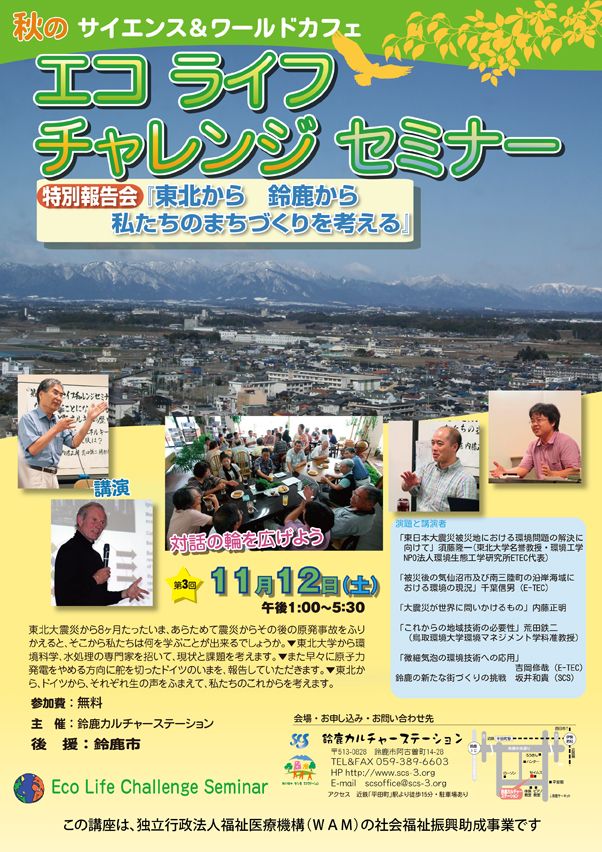 須藤先生をはじめETECの皆様は、震災の被害者でもありまた適切な対処を図ろうとする専門家集団でもあり、大震災や原発事故から8ヶ月を経た今、直接お話を伺えることは、問題の本質やこれからを考えるための得難い機会となることと思います。