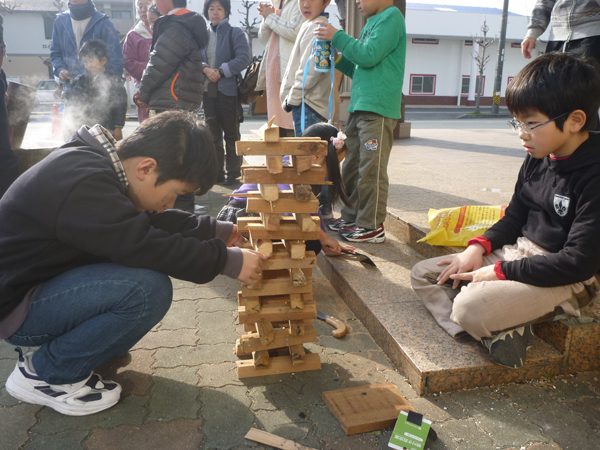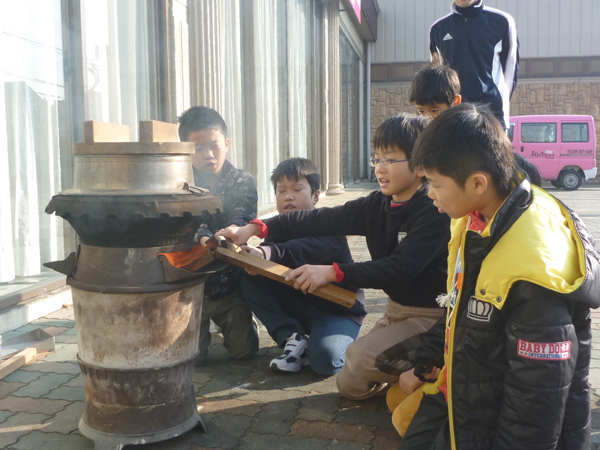 薪を燃やした直火で蒸しから行うのが杉本流。子どもたちで薪の準備です。