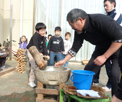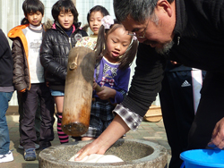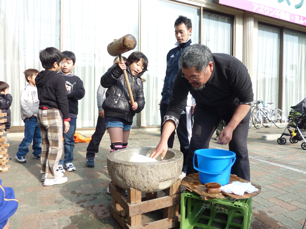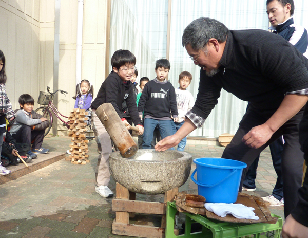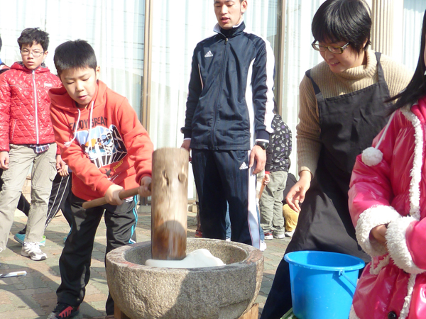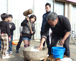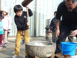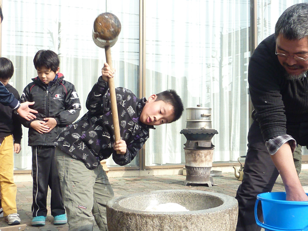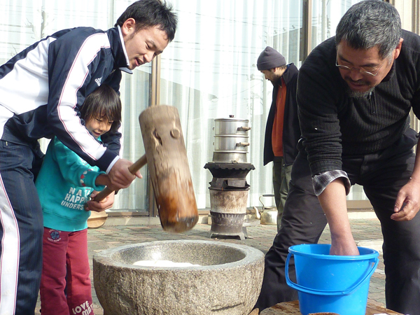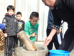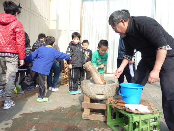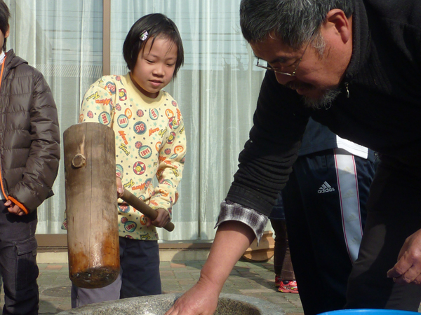 この日は杉本信之さんに協力してもらって、お餅つきを体験しました。