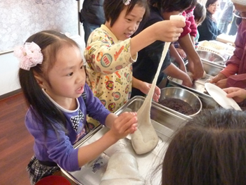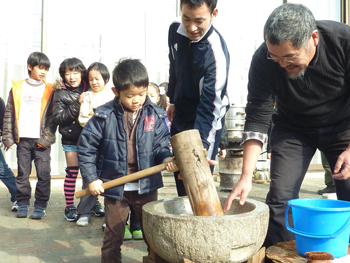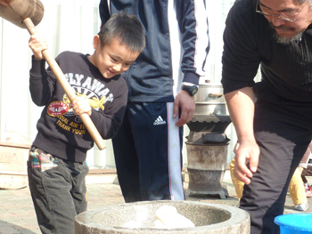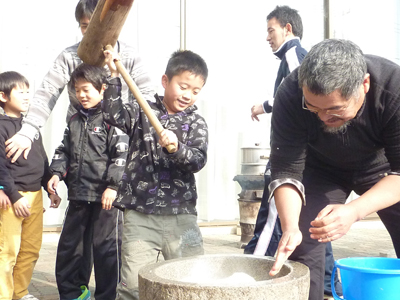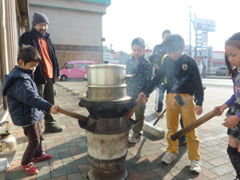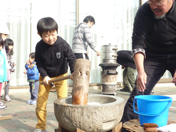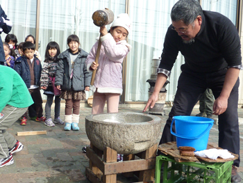もっとつきたい子はまた並んでついたり、 とても杵が持てそうにない小さな子もやりたくなるようで、お兄さんが手を添えてつきました。