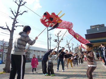 餅つきの後は、子どもたちで「龍舞」を体験しました。