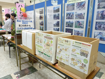 段ボールコンポストの実物展示。
