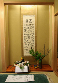 この写真は、初釜の待合の軸「百寿」と蓬莱飾り。炭の蓬莱飾りを今年はしっかりやってみようとした。百寿の軸は、初釜の朝、内藤さんが山科から持参してくれたもの、蓬莱飾りの米は杉本さん、うらじろ・ゆずり葉と青竹は栗屋さん高崎さんの手でそれぞれ里山から届いた。花入れの梅や千両の枝は、広島の隆杉さんの実家から。炭の上に載っただいだいはある若いご夫妻がジャム用に育てていたのが届けられてきた。点前の会記は、秀子さんの小筆の字が美しいと感じて、書いてもらった。