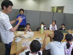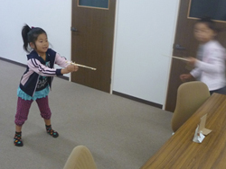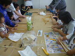 この日はあいにくの雨模様。予定を変更して急きょ割り箸鉄砲づくりをやりました。