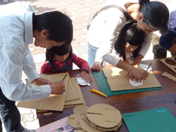 やはり、小さい子は、ダンボールを切り取るのがちょっと無理なようで、お父さんお母さんがそこはハッスルして頂きました。段ボールと格闘しながら、1時間ほどかけて、ようやく完成です。パーツを組み立てるにもちょっと知恵を使います。