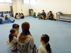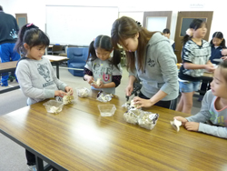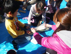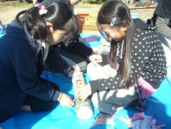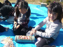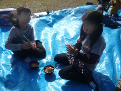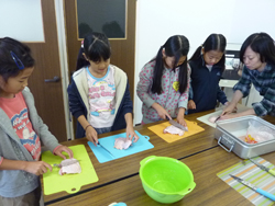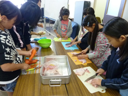 女の子でニンジン、ゴボウ、鶏肉、シメジを下ごしらえ。