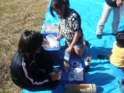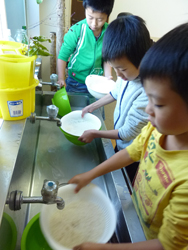 竹飯盒、一釜3合づつの米を洗います。男の子でしっかり仕上げてくれました。