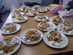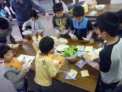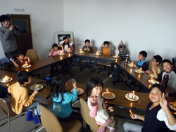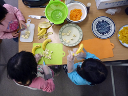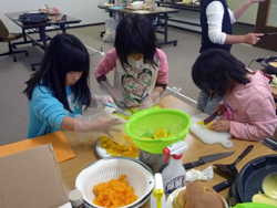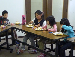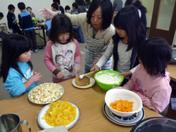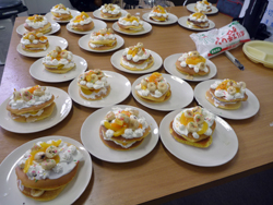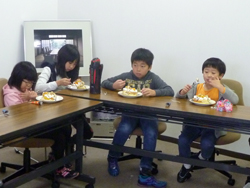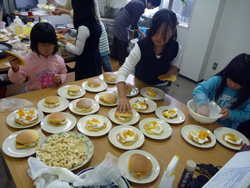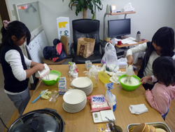 女の子はいよいよ飾り付けの準備。クリームも果物も準備します。