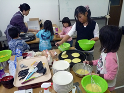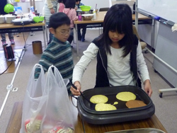 女の子はケーキ作り。まずは土台のホットケーキを作ります。