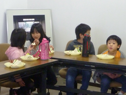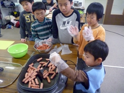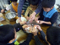 お姉ちゃんのやるのをみて、一年生も上手に焼き上げます。