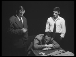 取調室で尋問されるジュリアン(モーリス・ロネ)=中央=と警部(リノ・ヴァンチェラ)=左=