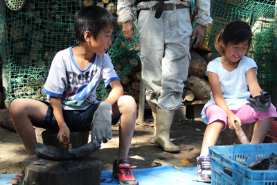 子どもたちも率先して中に入り、炭出し作業を手伝います。