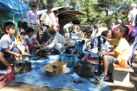 好天に恵まれた秋の清々しい一日。「スズカの里山」(徳居町)では「炭出し祭り」が開催されました。主催はNPO法人鈴鹿循環共生パーティ。「親子でつくる・・・里山、暮らしの豊かさ」の呼びかけに、市内から訪れた親子連れの参加者は、里山の豊かさを存分に味わったようです。