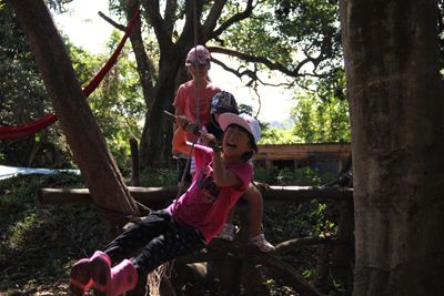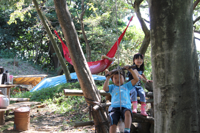 里山に入るなり、手製のターザンブランコで遊ぶ子どもたち