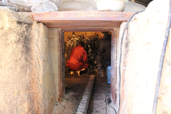 中は、木炭の噴煙で、息が苦しい。