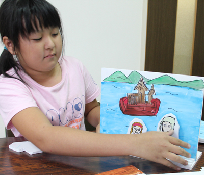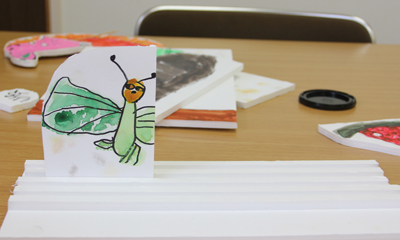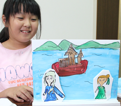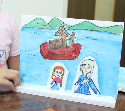 こどもアートスクールは、絵を描いたり、工作をしたり、想像の翼を広げて、その子ならではの創作をしています。今回は、スチレンボードを使った立体紙芝居を作りました。