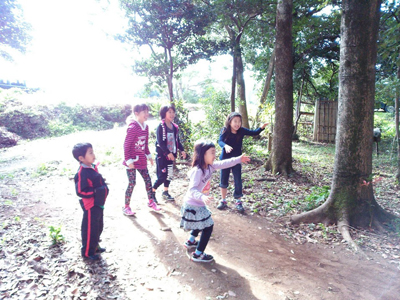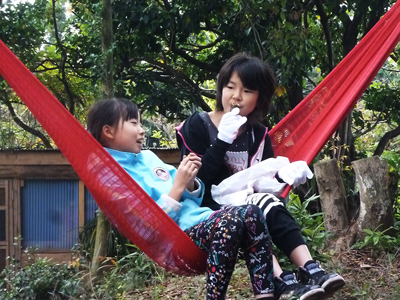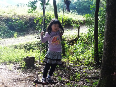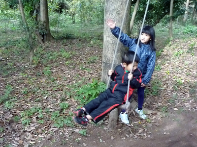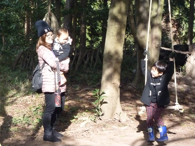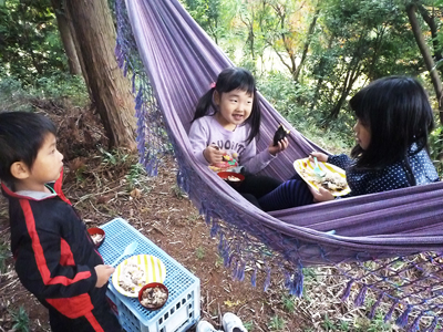 里山に入るなり、走り出す子、ターザンやブランコに行く子、ハンモックに寝転ぶ子、小屋を見に行く親子… 自然の中で解放され、それぞれ気の向くままに・・・・・
