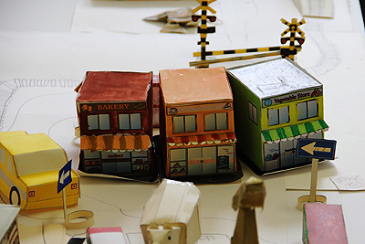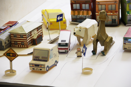 創造塾で制作してきたペーパークラフトによる街並みです。