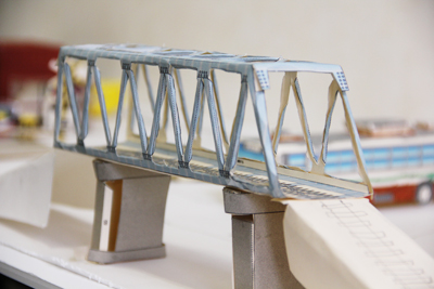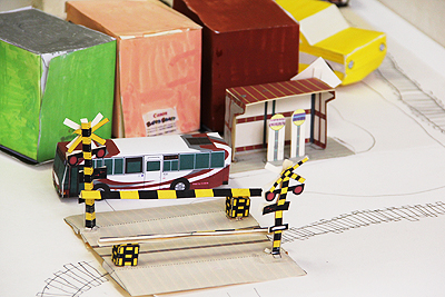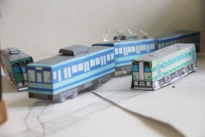 建物・乗り物はこう君作。半年前から、今年の作品展を思い描いて、電車やバス、商店街など、どんなパーツがあったらいいかな、と構想を練ってきました。
