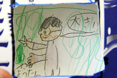 彼は、ひょうたん物語を、牛乳パック紙芝居で再現しています。