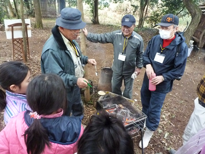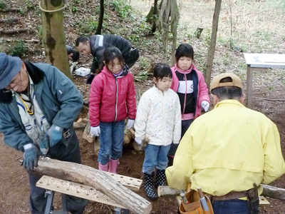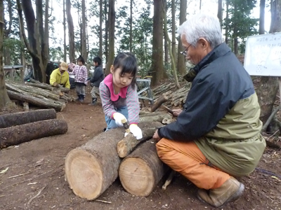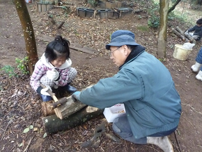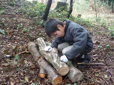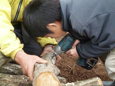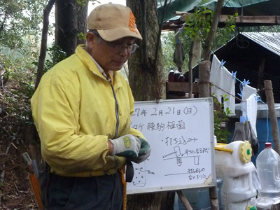 里山の高崎さんから、種菌の植え方を教えてもらいました。