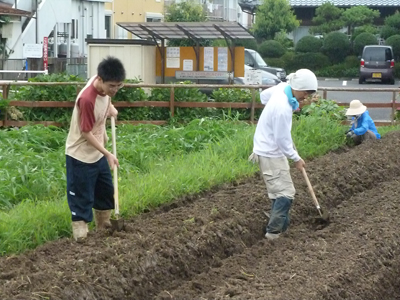 そして、お兄さんスタッフは畑の畝たてと大豆を蒔く溝を切って準備をしていました。