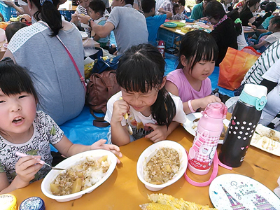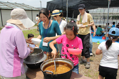 スイカ割後は、スタッフや小学生チームが作ってくれた、カレーライス。