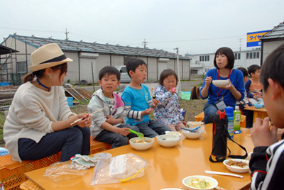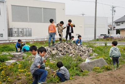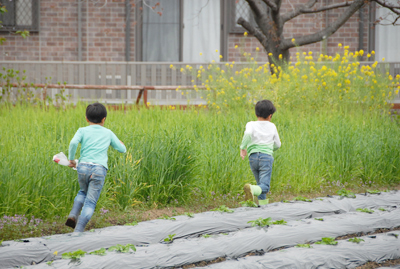 子どもたちは、食べ終わって、はたけのあちこちに散って、