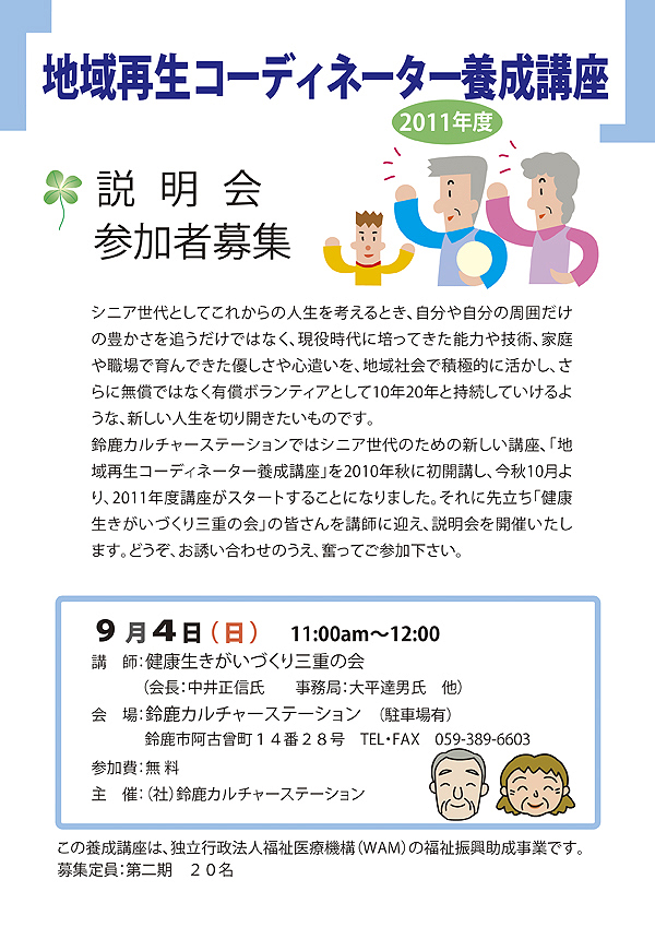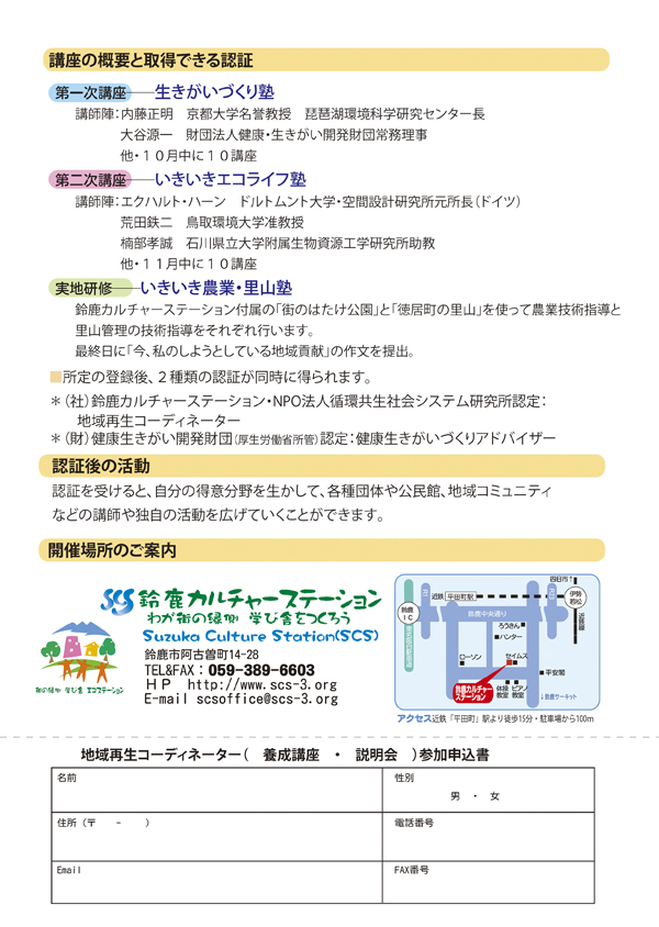 この講座の講師陣には、財団法人健康生きがい開発財団、鈴鹿市社会福祉協議会、NPO法人循環共生社会システム研究所など実務者や科学者に加えアズワンファームや里山の実務者、さらに第一期メンバーから早速講師もでて、講座を設けるなど、多彩である。