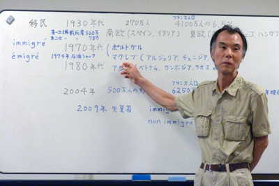 初めにこんなことを大島さんから出されたら、「難しいやろうなあ。理解も共感もできやしないだろうな」と、僕の中では勝手に思いが出てきた。ホワイトボードには、全面を使って、フランスの“移民”についてのことが数字と文字とを使って、あらかじめ書かれていた。見て、その中身の方へと自分の関心が向いてゆく。
