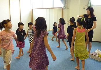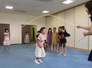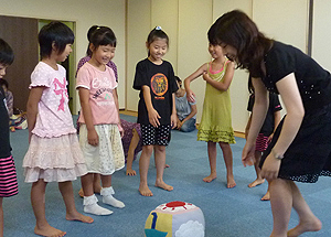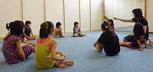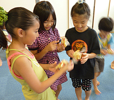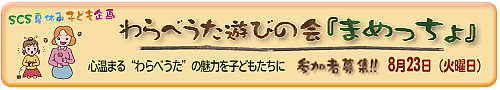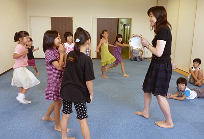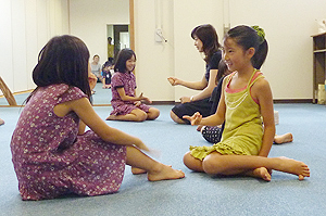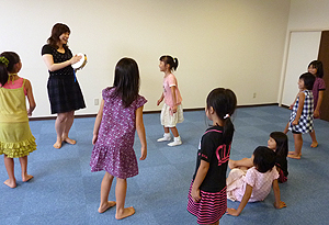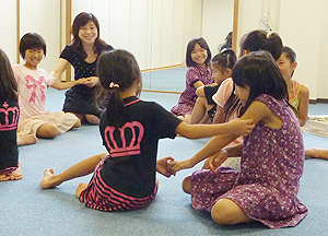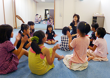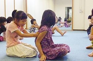 素朴で美しい“わらべうた”に乗って、遊びを楽しむ「まめっちょ」が8月23日に開催されました。講師は中原尚美さん。その澄んだ歌声が子どもたちをわらべうたの世界に引き込んでいきます。