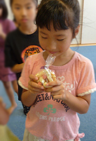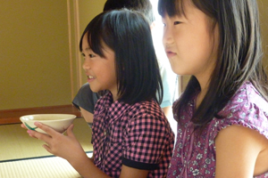 1年間お稽古を積んできた小学2年生の駒田秀果ちゃん(写真右)と古市ひなたちゃんが、今日はそのお点前を披露。思ったように出来たかな?