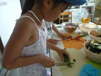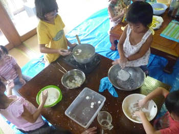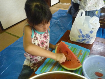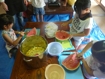 続いてフルーツポンチ作りチーム、今回の参加者の松原さんが差し入れてくれた大きなスイカを使って、スイカを切り出し、白玉団子をつくりました。