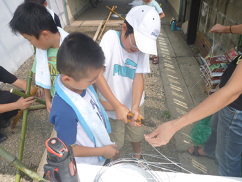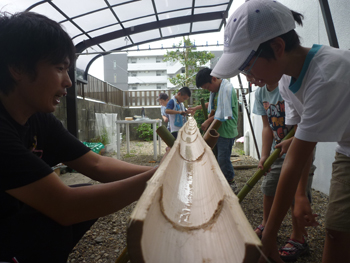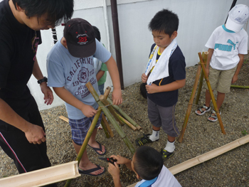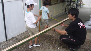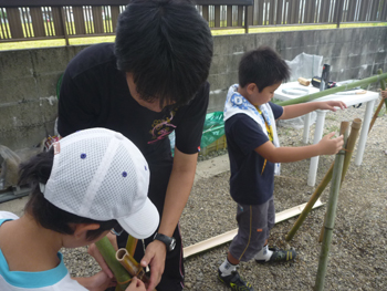 いつも遊んでいる里山から高崎さんが切り出してくれた竹を使って流し台を作ります。