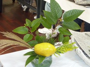 今回の花材は、カリン、ススキ、ヤシャブシ、背高泡立草。花器は、ペットボトルを工夫して使いました。最近の傾向として、身近なものを使って、気軽に置ける生花が流行っているようです。